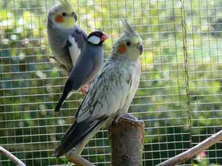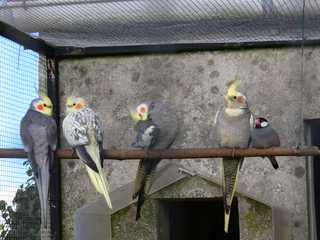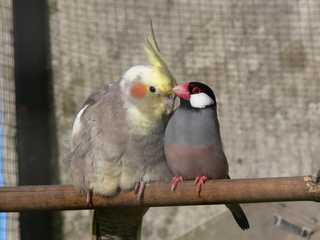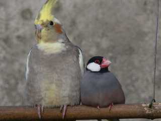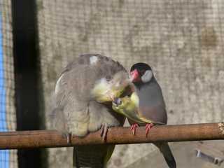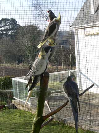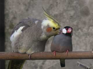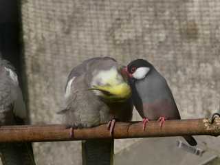 Par une journée quasi printanière (le mercredi 6 janvier 2008), les oiseaux ont bien profité du beau temps. J'ai réussi à prendre des photos d'un gros câlin entre le padda et une jeune calopsitte. Chacun peut imaginer la conversation qui accompagne ces photos.